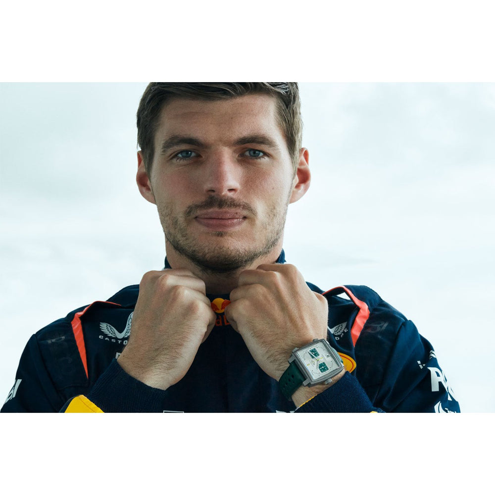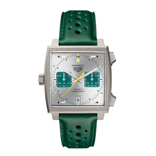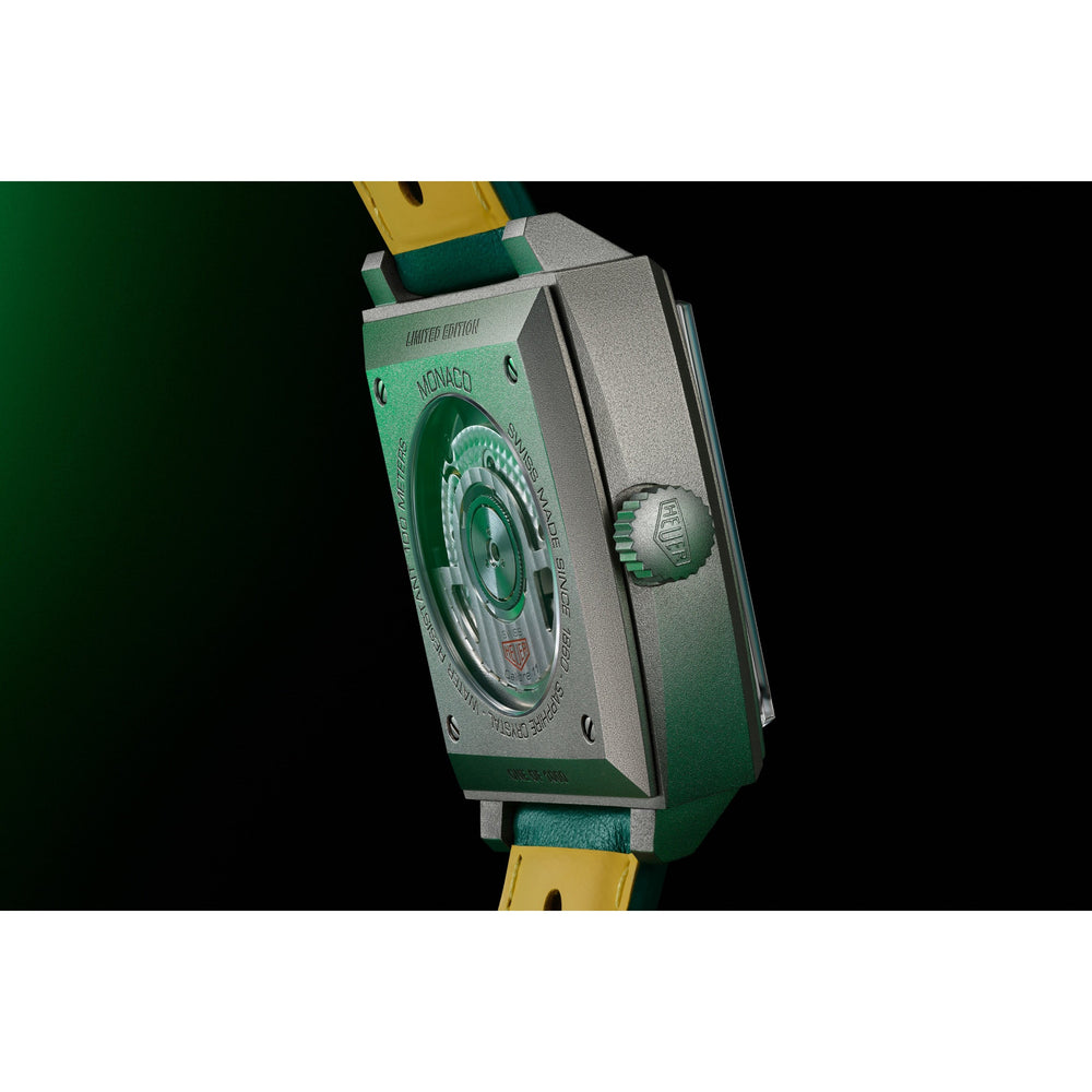 Questo affascinante orologio, continuazione audace della palette di colori ispirata alle corse, rappresenta l'estetica vivace ma elegante del famoso Monaco, con un omaggio all'iconica livrea Racing Green, simbolo del glorioso passato dei piloti britannici.
