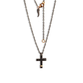 COLLANA CON CROCE MEDIA IN TITANIO, ORO ROSSO 18 KT, ORO ROSSO 9 KT, DIAMANTI BLACK E CATENA.