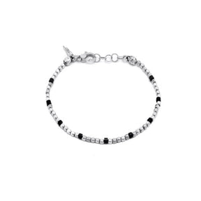 Elementi in argento, fuso e brunito, alternati a sferette di onice nera, con prevalenza ritmica degli elementi in argento. Questa la bellezza semplice del Bracciale Dadini e Onice. Realizzato completamente a mano in azienda.