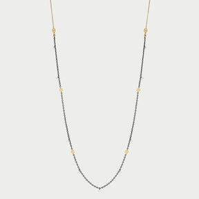 Collana lunga 95 cm, con catena verniciata e in argento dorato, arricchita da zirconi nudi colorati pendenti e medagliette. Un mix perfetto di luce e stile boho-chic.
