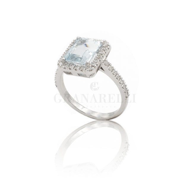18 kt Weißgoldring mit rechteckigem Aquamarin und Diamanten.