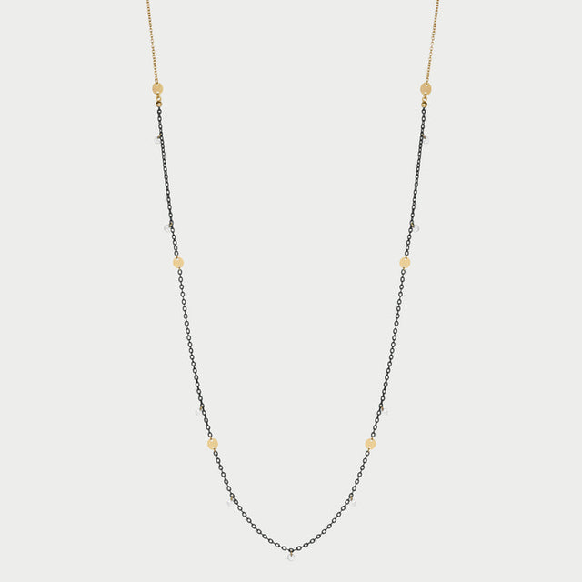 Collana lunga 95 cm, con catena verniciata e in argento dorato, arricchita da zirconi nudi colorati pendenti e medagliette. Un mix perfetto di luce e stile boho-chic.