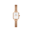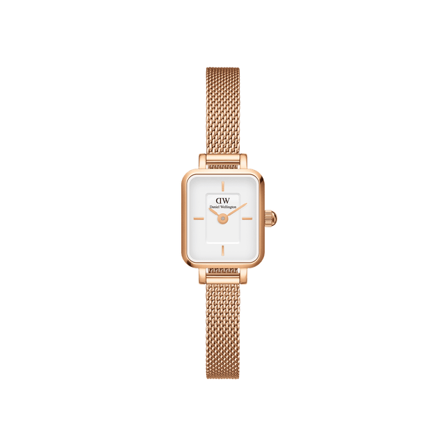 Quadro’s refined angles have been further pared down to become our smallest watch ever. This version of Quadro Mini features our most traditional colorway, accented with a rose gold mesh strap.