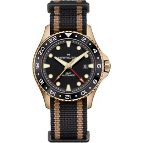Progettato per i marinai moderni e gli inarrestabili lupi di mare, il Khaki Navy GMT Automatic è l’orologio da viaggio per eccellenza, grazie alla precisione del cronometraggio di più fusi orari. Dotato di una cassa in bronzo con cinturino NATO nero e oro, il quadrante nero è impreziosito da indici in Super-LumiNova® verde chiaro, mentre la lancetta rossa indica la funzione GMT e facilita la lettura del secondo fuso orario. Caratterizzato da un’impermeabilità fino a 30 bar, una corona a vite e una riserva di carica fino a 80 ore, il Khaki Navy GMT Automatic ti consentirà di esplorare nuovi orizzonti con sicurezza e stile.