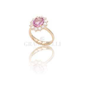 Anello in oro rosa 18 kt con zaffiro rosa taglio ovale e contorno di diamanti.