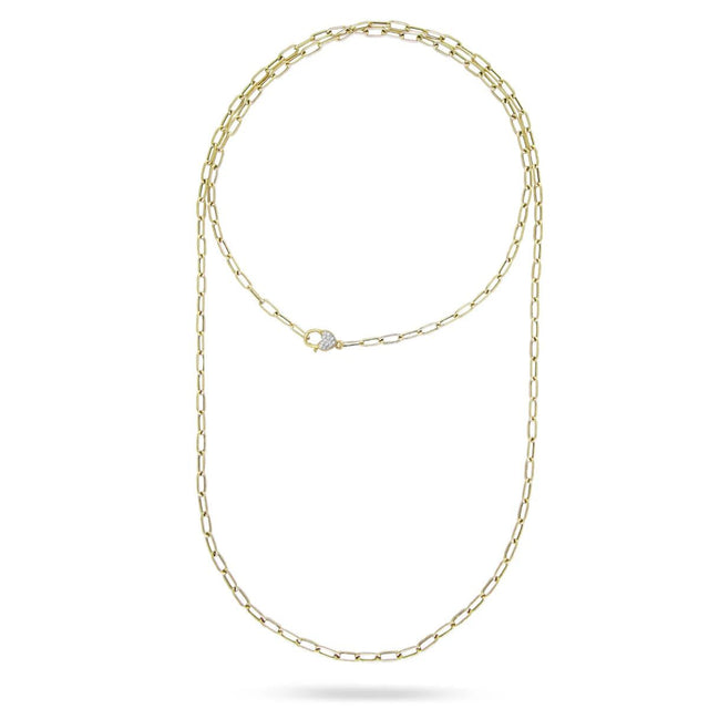 Long necklace with cheval mesh to be worn with one, two or three turns. Closure with heart-shaped lobster clasp with white zirconia.