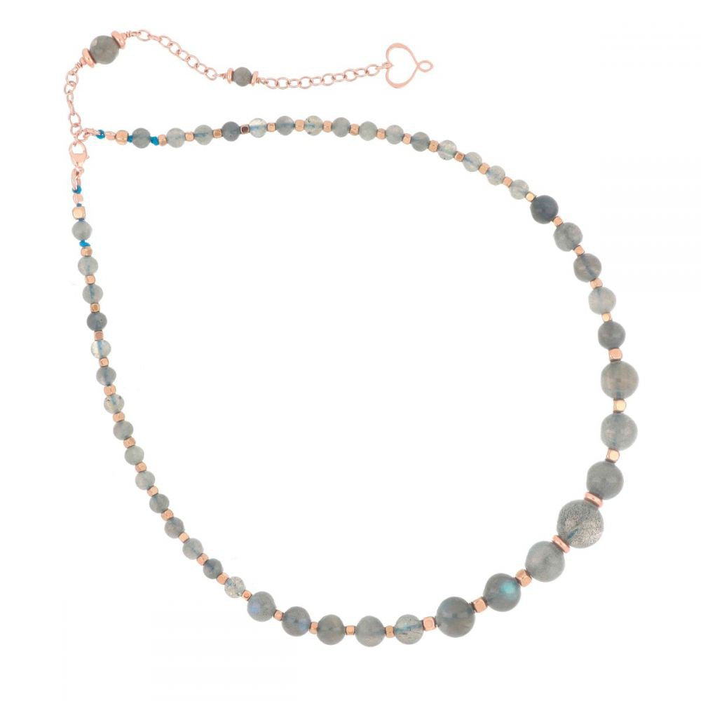 Choker made of 925 silver with high thickness and resistance rose gold plating with Labradorite stones in different sizes and hematite cubes.