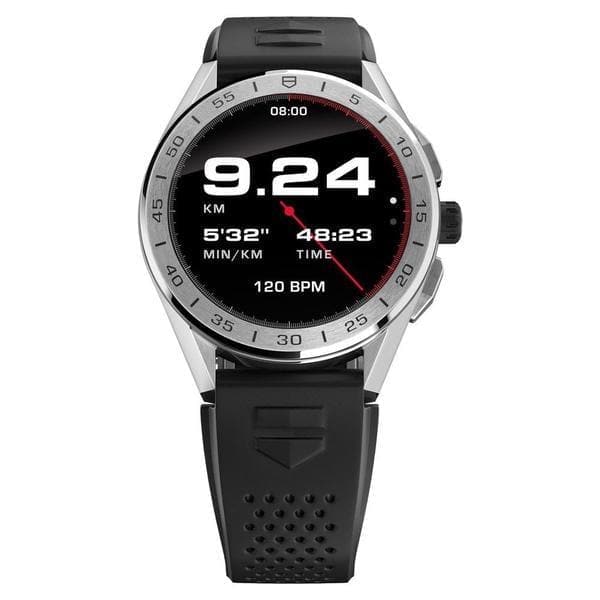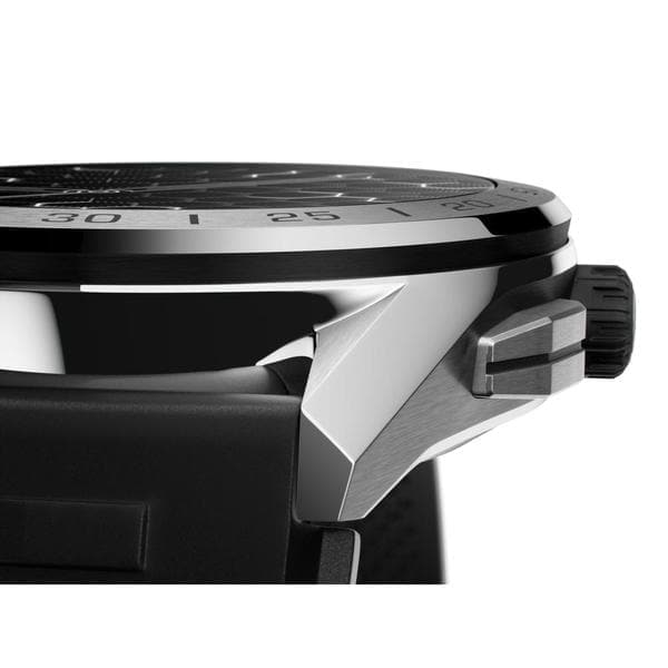 Stainless steel case, inchable sapphire crystal, steel bezel: innovative and high quality materials for this 45 mm Heuer Connected Tag HEUER clock, waterproof up to 50 meters.