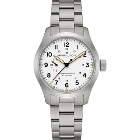 Il Khaki Field Mechanical Power Reserve 40 mm rende omaggio al design tradizionale e alla funzionalità essenziale della famiglia Khaki, introducendo al contempo caratteristiche moderne e le ultime novità in fatto di tecnologia e innovazione orologiere. Dotato di un nuovo movimento a carica manuale H-23, sviluppato da ETA in esclusiva per Hamilton, consente per la prima volta di visualizzare direttamente sul quadrante la riserva di carica di 80 ore. Dotato di un bracciale in acciaio, il quadrante bianco mostra le diciture “power reserve 80 hours” (“riserva di carica di 80 ore”), “F” (completamente carico) ed “E” (scarico), sottolineando questa caratteristica funzionale d’eccezione.