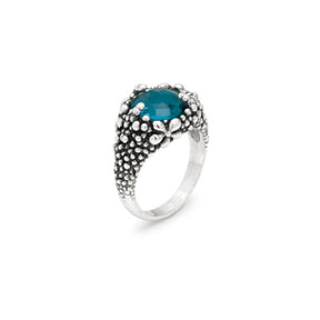 Giovanni Raspini - L’anello Blue Ivy Grande incanta con un grande cristallo rotondo sfaccettato nella delicata tonalità del celeste. Il decoro, realizzato con l’antica tecnica della fusione a cera persa, è caratterizzato da un motivo ispirato al mondo floreale, dove piccoli fiorellini dai petali bombati si moltiplicano fino a dissolversi in micro-sfere. Interamente fatto a mano in azienda.