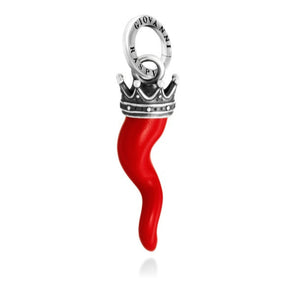 Un raffinato amuleto portafortuna, che unisce tradizione e artigianalità. Questo piccolo corno, realizzato in resina color rosso corallo, è sormontato da una corona in argento fuso secondo l'antica tecnica della fusione a cera persa. Scoprirete un mondo fantastico e felice, dove è un piacere perdersi e sognare.