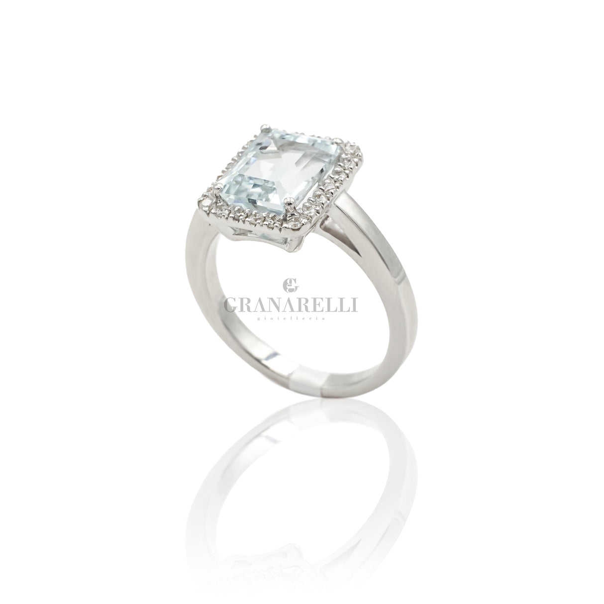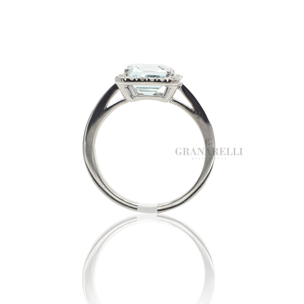 18kt white gold ring with Rectangular cut Aquamarine and outline of Brilliant cut White Diamonds