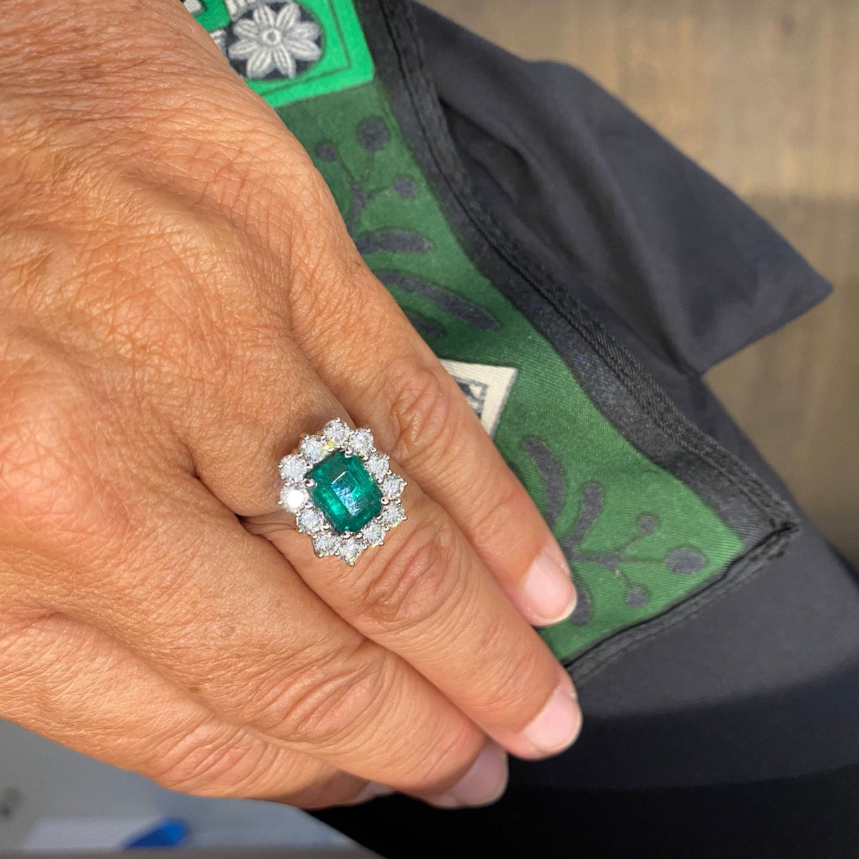 18kt White Gold Ring with Zambian Emerald and Diamonds, created in the laboratory by our expert Goldsmiths.