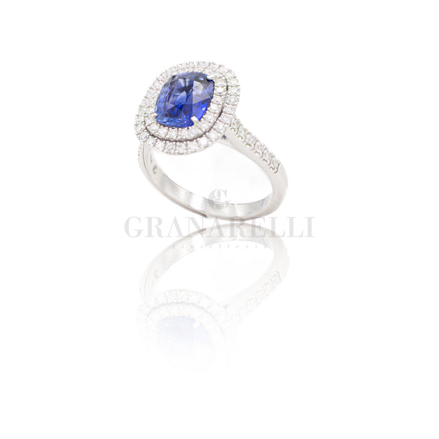 Anello in oro bianco 18 kt con zaffiro taglio"cuscino" e doppio contorno di diamanti.
