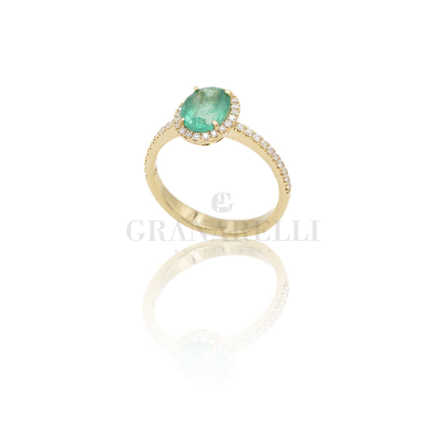 Anello in oro giallo 18 kt con smeraldo taglio ovale e contorno di diamanti.