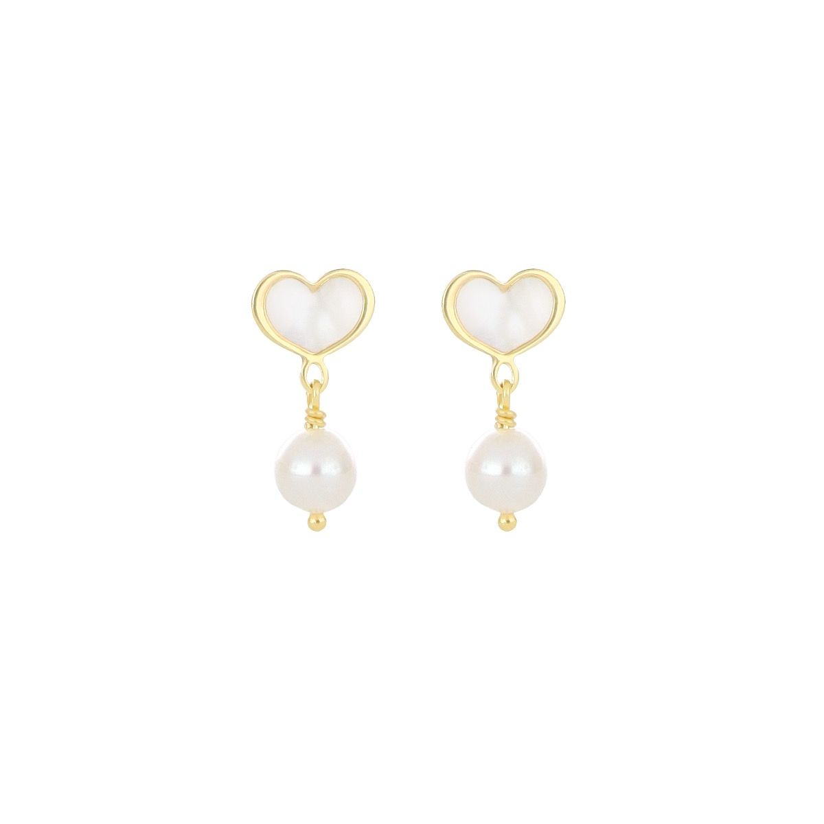 Pair of single lobe earrings with Maman heart with mother of pearl and white pearl pendant. Made of 925 silver with yellow gold plating with high thickness and resistance.