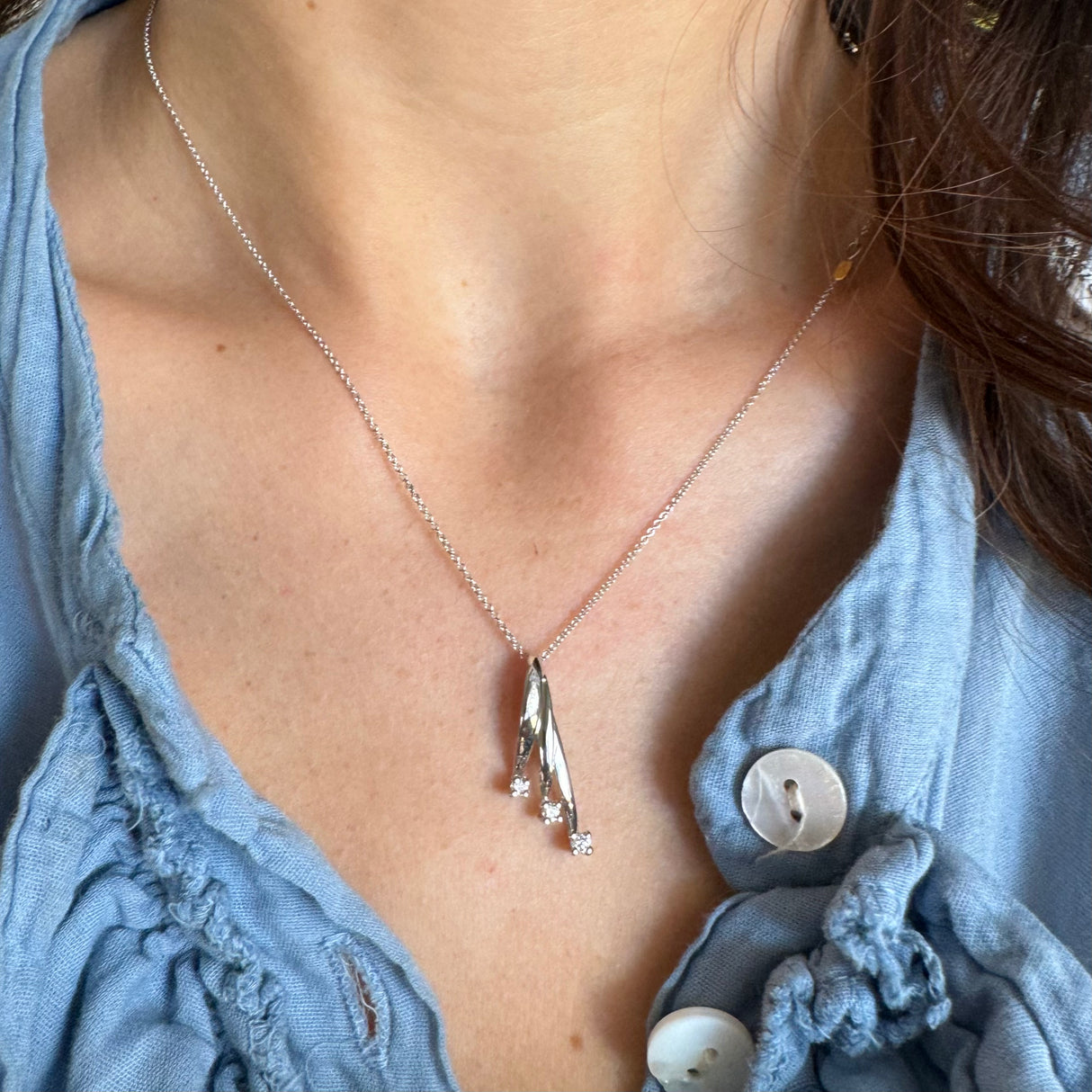 Collar de oro blanco y diamantes cortados brillantes blancos. Zefiro es una delicada expresión de elegancia, una colección dedicada a aquellos que aman la simplicidad sin renunciar a una joya refinada. La joya perfecta para usar todos los días.