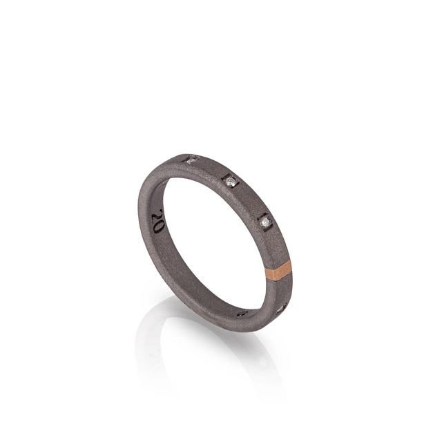Anello uomo in titanio diamanti white e oro rosso 18 kt. Una rivisitazione della più classica girodito, questa fedina è contornata da 43 diamanti white per una caratura totale di 43 punti che raggiungono il punto in cui e stato inserito un riportino in oro rosso 18 kt. L'immancabile diamante black da 1 punto contraddistingue il marchio MANO|J. Una creazione che unisce leggerezza, eleganza e preziosità.