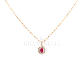 Línea de cuello en la tripulación "LIGHT" 18 KT ORO ROSA DE ROSA CON LA PLAZA DE RUBY CENTRAL Y EL CONTORNO DE DIAMANTE BLANCO.