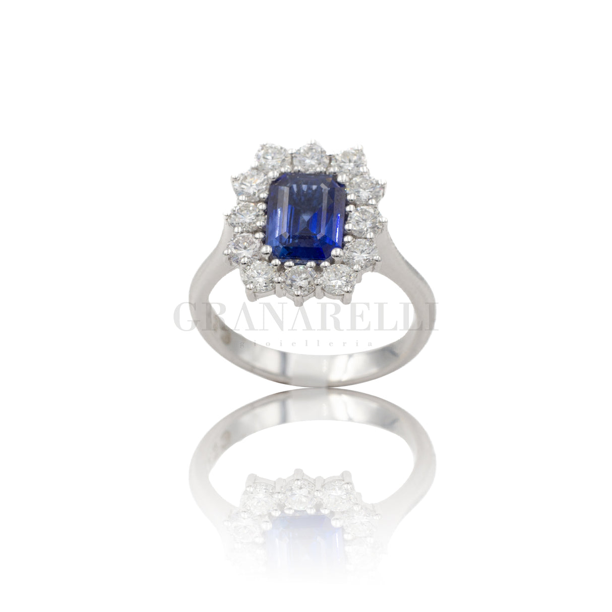 Anillo de oro blanco de 18 kt con zafiro y diamantes.