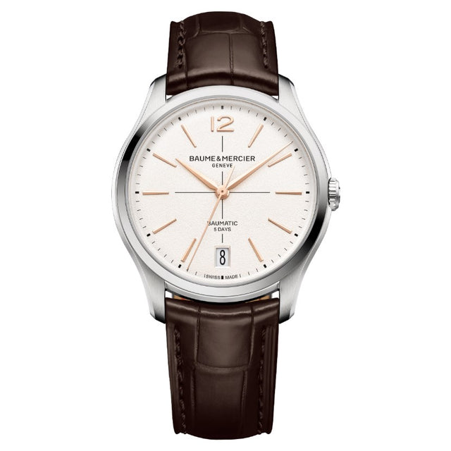 Il Clifton 10773 ha una cassa rotonda in acciaio inossidabile satinato e si aggiunge alla collezione in un formato di 39 mm. La cassa presenta una corona in acciaio e un fondello aperto in zaffiro. Il sottile quadrante bianco sporco con finitura granulata, orlato da una minuteria e da un mirino neri, mette in evidenza il numero arabo a ore 12, gli indici dorati e sfaccettati rivettati a forma di trapezio e le lancette a forma di alfa. È dotato di un movimento Baumatic a carica automatica (BM13-1975A) con riserva di carica di 5 giorni e impermeabilità fino a 5 ATM. Il cinturino intercambiabile in alligatore marrone è dotato di un affidabile sistema di sostituzione senza attrezzi.