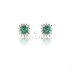 Boucles d'oreilles lobes en or blanc de 18 kt avec des diamants centraux émeraude et blanc.