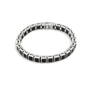 Argento brunito e resina nera per un iconico bracciale Tennis Box. Realizzato con una sequenza di castoni quadrati in argento, ognuno dei quali ospita una resina nera leggermente opaca. Un dettaglio che aggiunge modernità e contrasto materico al gioiello. Fatto a mano in azienda. Giovanni Raspini.