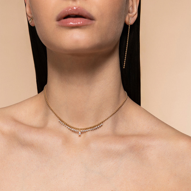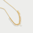 La parte centrale della collana è impreziosita da una cascata di zirconi luminosi, con una pietra centrale leggermente più grande che crea un punto luce unico