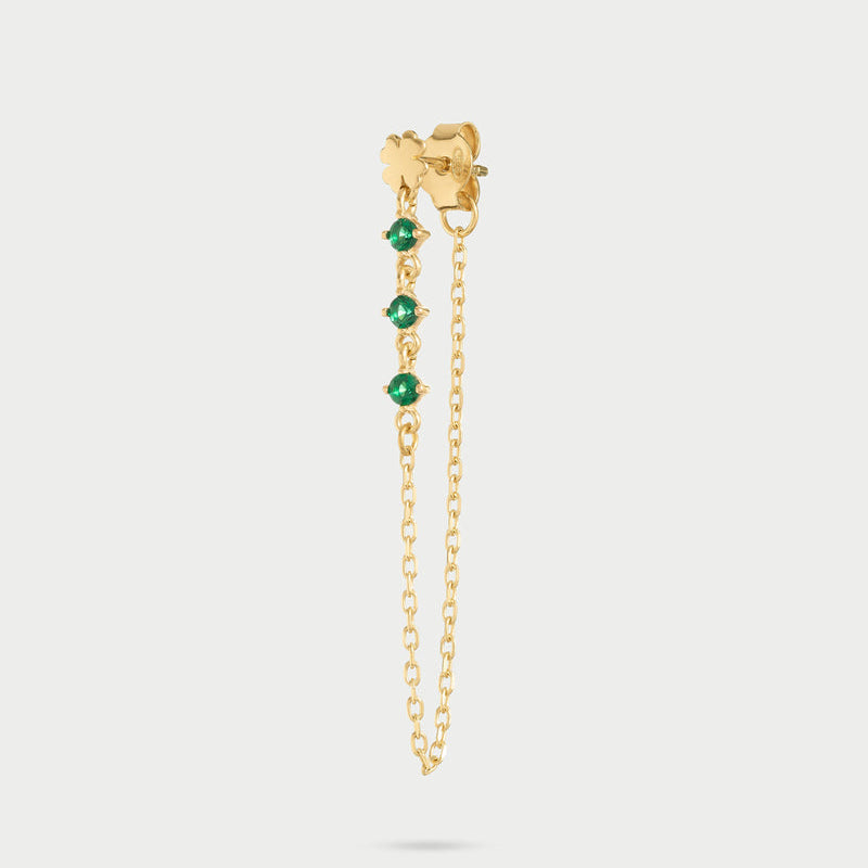 Orecchino singolo con quadrifoglio catenella e tre punti luce in zircone verde