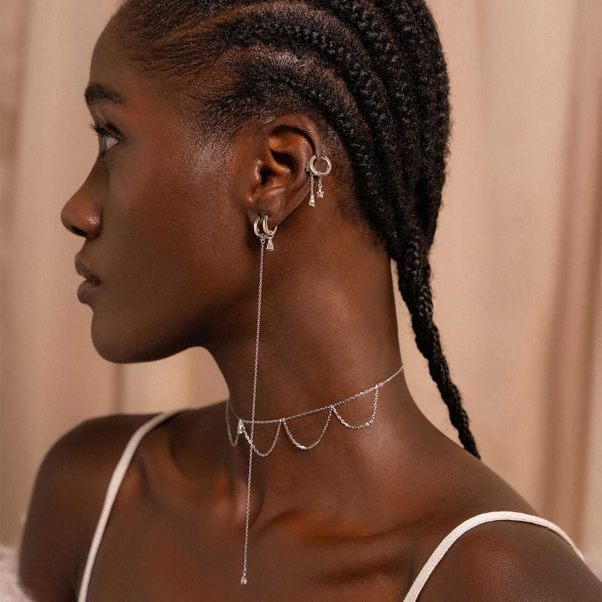 Orecchino singolo in argento 925 con cerchio piccolo, catena extra-long fine e delicata e goccia pendente finale in zircone