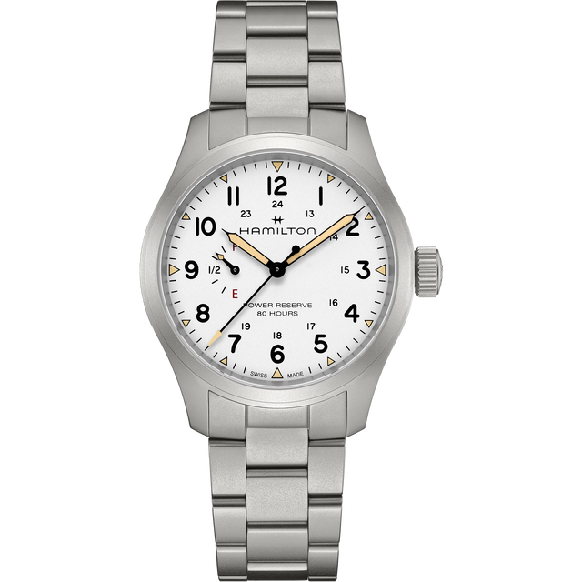 Il Khaki Field Mechanical Power Reserve 40 mm rende omaggio al design tradizionale e alla funzionalità essenziale della famiglia Khaki, introducendo al contempo caratteristiche moderne e le ultime novità in fatto di tecnologia e innovazione orologiere. Dotato di un nuovo movimento a carica manuale H-23, sviluppato da ETA in esclusiva per Hamilton, consente per la prima volta di visualizzare direttamente sul quadrante la riserva di carica di 80 ore. Dotato di un bracciale in acciaio, il quadrante bianco mostra le diciture “power reserve 80 hours” (“riserva di carica di 80 ore”), “F” (completamente carico) ed “E” (scarico), sottolineando questa caratteristica funzionale d’eccezione.