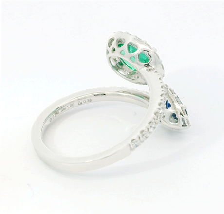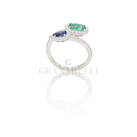 Anello doppio in Oro Bianco con Smeraldo 1.00kt e Zaffiro 0.38kt con Diamanti