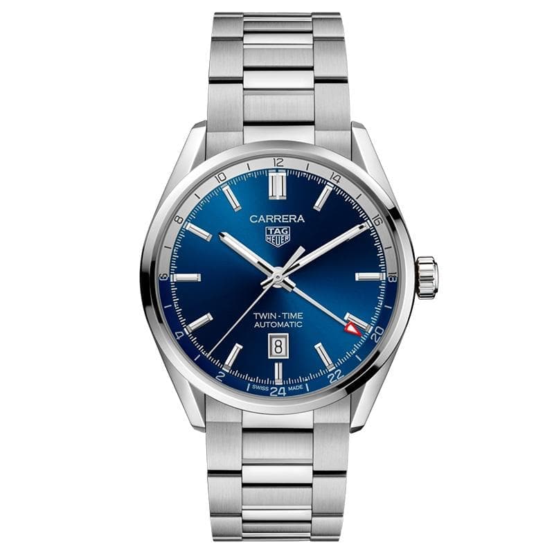 Il TAG Heuer Carrera Twin-Time è un modello elegante dal carattere determinato per chi è sempre in movimento per lavoro. Con un originale quadrante blu e design reimmaginato, quest'orologio mostra contemporaneamente due fusi orari. Il business partner ideale.