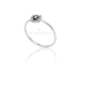 Anello in oro bianco 18 ct con Quadratino con Zaffiro e Diamanti bianchi.