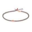 Bracciale uomo in titanio, rubini sul punto luce e chiusura in oro rosso 9 kt. Un punto luce in oro rosso 9kt, sulla quale sono incastonati 2 rubini da 3 punti per una caratura totale di 6 punti, è l'elemento principale del bracciale. Al punto luce, si collega un'elegante catena groumette che termina con una preziosa chiusura a gancio in oro rosso 9 kt. Alla chiusura in oro rosso si trova l'affascinante charms pendente rosso. Un comodo e prezioso bracciale che per leggerezza e manifattura, permette massimo comfort e adattabilità ad ogni polso.