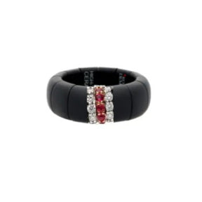 Anello Ceramica Nera Satinata 3 Barrette Rubini e Diamanti Bianchi