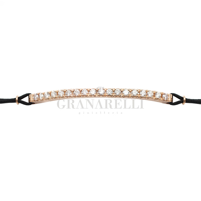 Bracciale barretta in oro rosa 18 carati e diamanti bianchi, su cordino nautico nero rifinito con elementi in oro rosa.