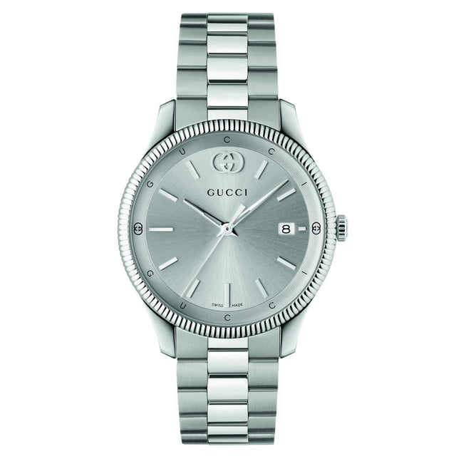 • Cassa in acciaio inox da 38 mm, quadrante tonalità argento con Incrocio GG, data a ore 3 e cinturino in acciaio inox