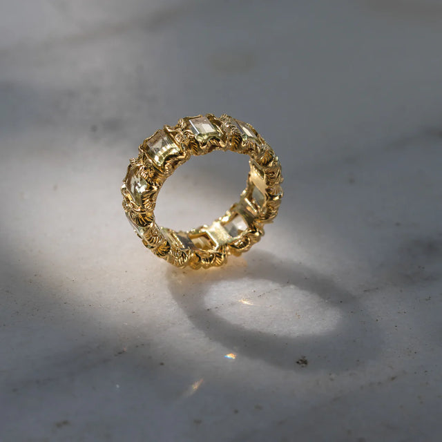 Questo anello in argento placcato oro 9 kt della collezione Eternity è realizzato con pietre naturali dal taglio smeraldo e intagliato a mano da maestri orafi Italiani.