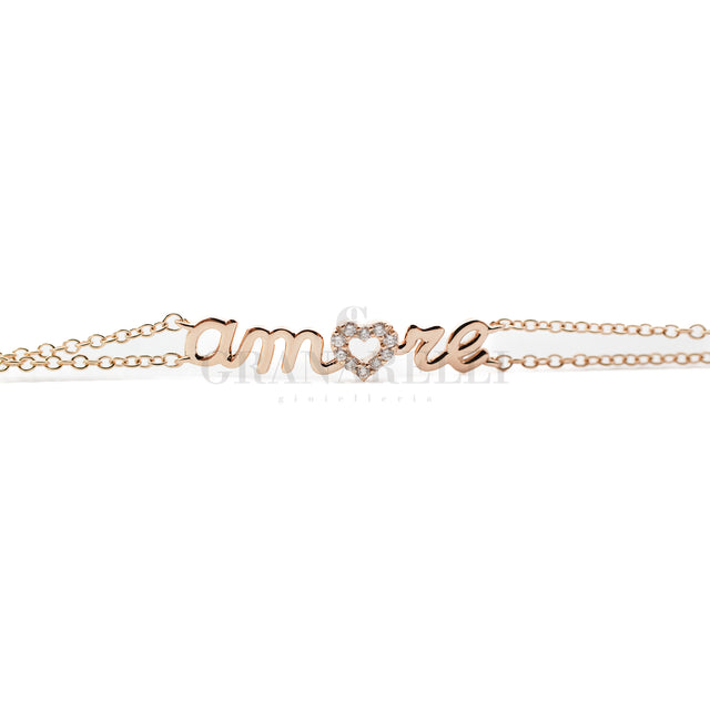 Bracciale doppia catena oro rosa 18 kt e diamanti bianchi su  cuore silhouette.