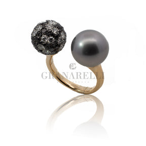 Anello in oro giallo 18 kt con Perle Thaiti e diamanti bianchi e neri taglio brillante.