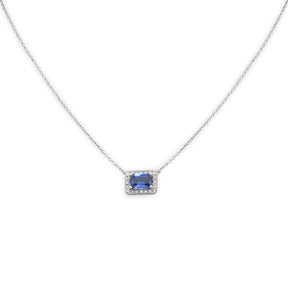 Girocollo con zaffiro taglio smeraldo contornato di diamanti taglio brillante in oro bianco, creato in laboratorio dai nostri Orafi esperti. .