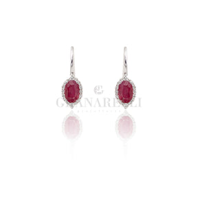 Orecchini in oro bianco 18 kt diamanti bianchi e rubino con pietra ovale