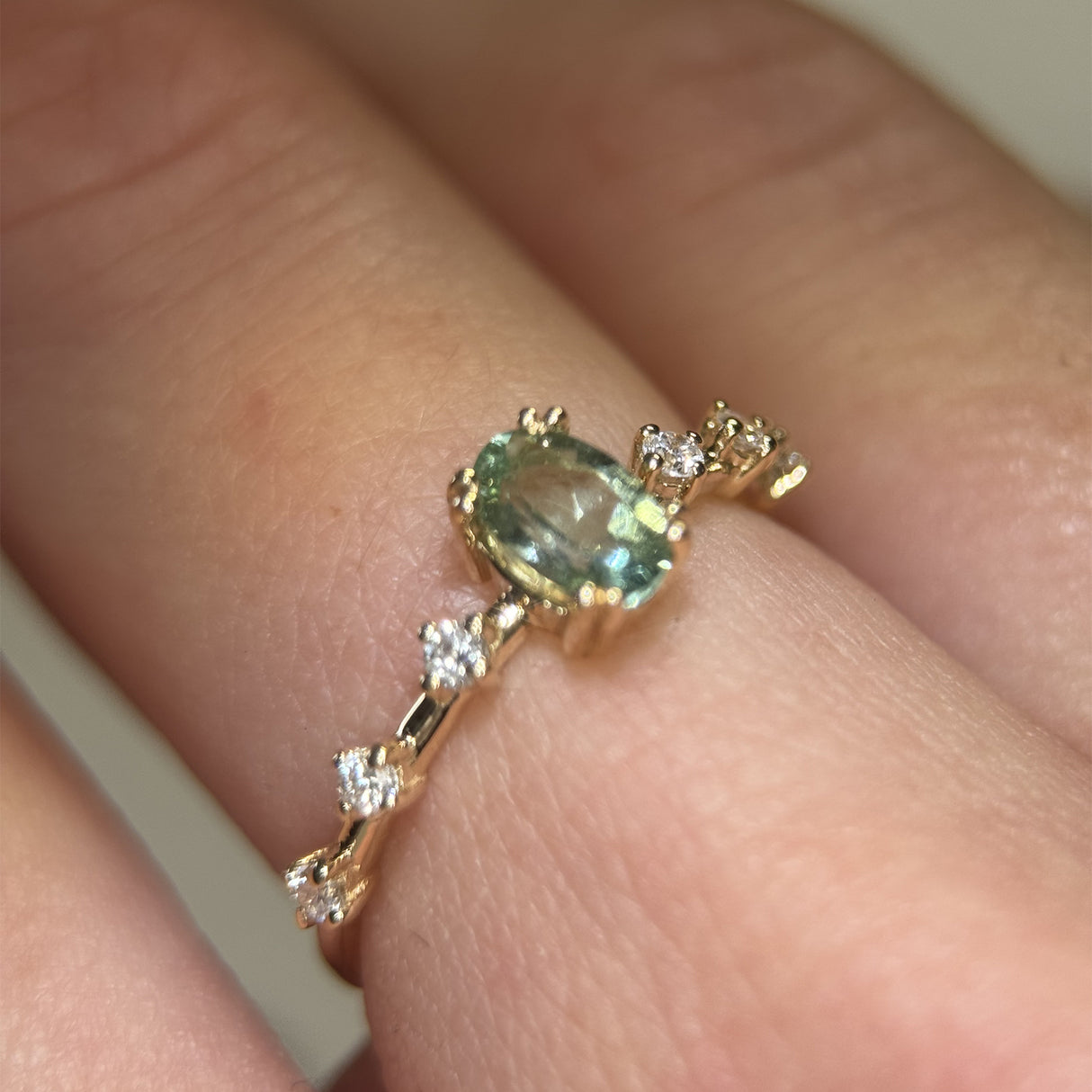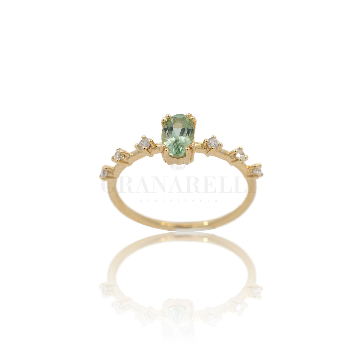 Un gambo leggero con diamanti incastonati e una tormalina naturale verde taglio ovale.