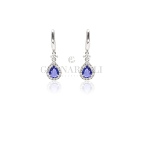 Orecchini boccola in oro bianco 18 kt con zaffiri e contorno di diamanti bianchi.