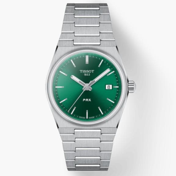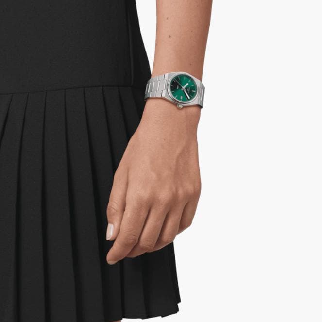 Tissot ripropone un design iconico della fine degli anni '70, con cassa e bracciale integrati. La cassa del Tissot PRX Lady misura 35 mm di diametro. Ha una linea leggermente a botte e ospita una lunetta liscia, sottile e rotonda.