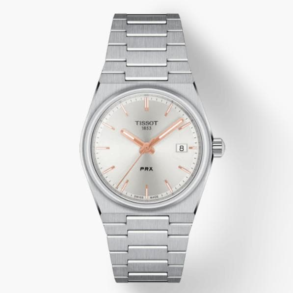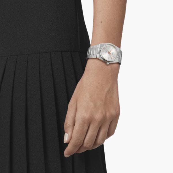 Tissot ripropone un design iconico della fine degli anni '70, con cassa e bracciale integrati. La cassa del Tissot PRX Lady misura 35 mm di diametro. Ha una linea leggermente a botte e ospita una lunetta liscia, sottile e rotonda.