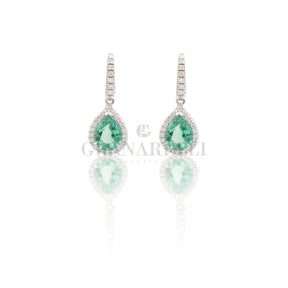 Orecchini Boccola in Oro Bianco con smeraldo taglio Goccia e Diamanti brillanti.
