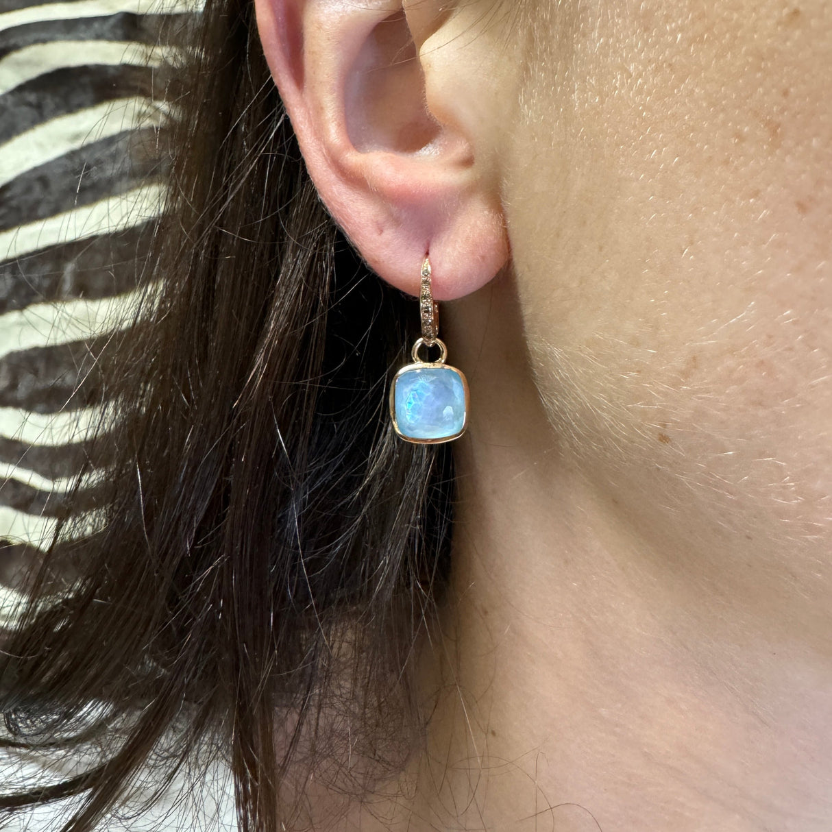 Orecchini boccola topazio azzurro e madreperla in oro rosa 18 kt e diamanti brown.