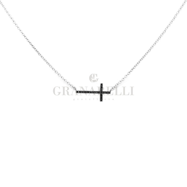 Girocollo Croce sul Fianco in Oro Bianco Diamanti Neri